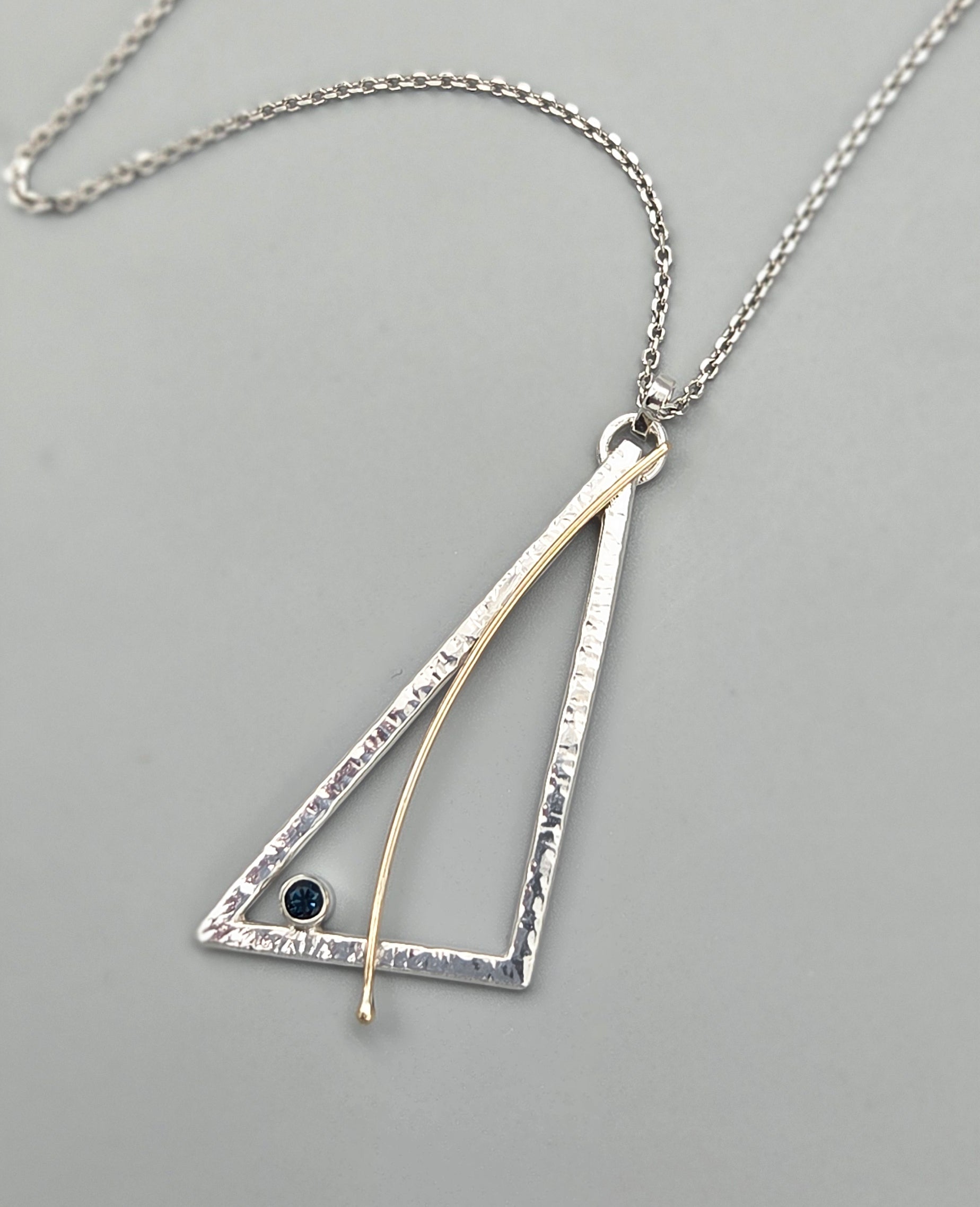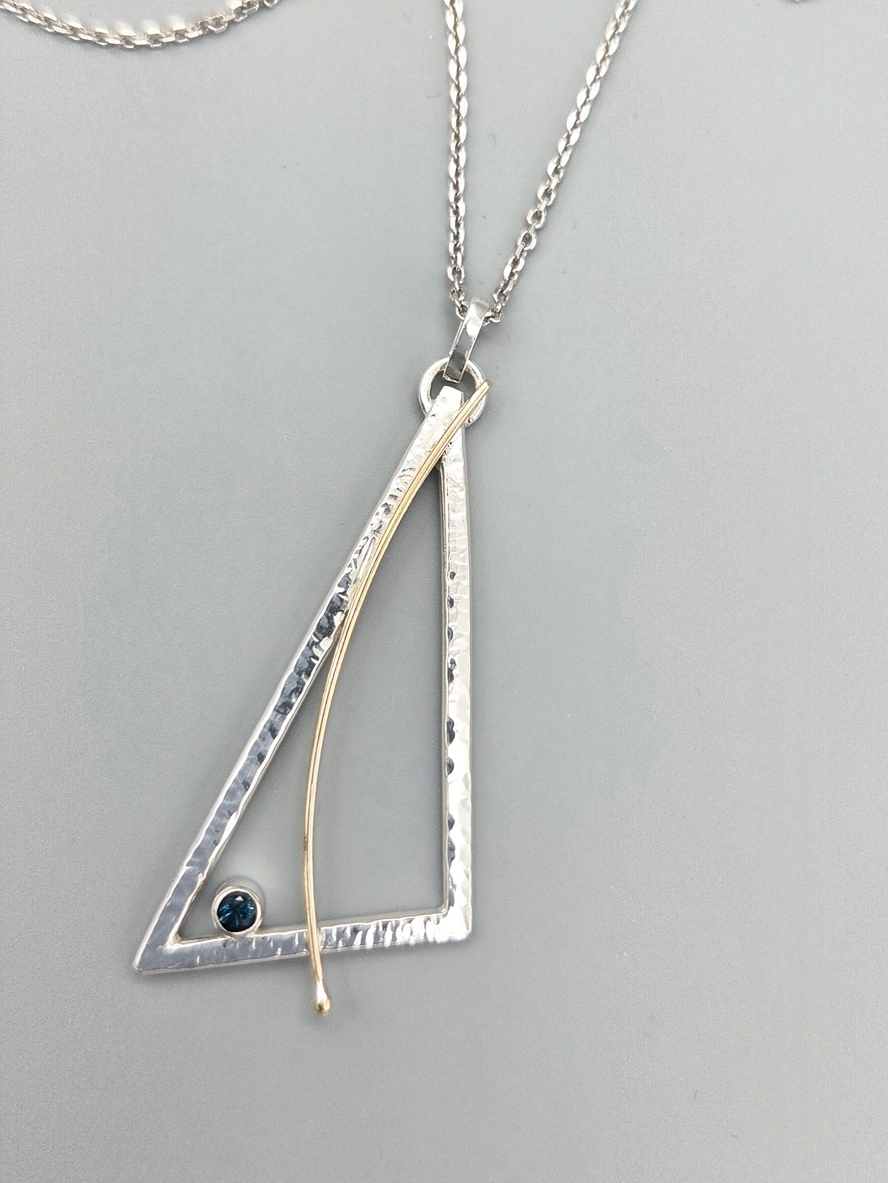 This elegant pendant showcases a striking London blue topaz, crafted in lustrous Argentium silver with a 14kt yellow gold accent. The textured surface catches light beautifully, while the angled gold sweep adds refined movement and dimension. The rich, deep blue of the natural topaz creates a sophisticated contrast against the warm gold, making this piece a timeless addition to any jewelry collection.