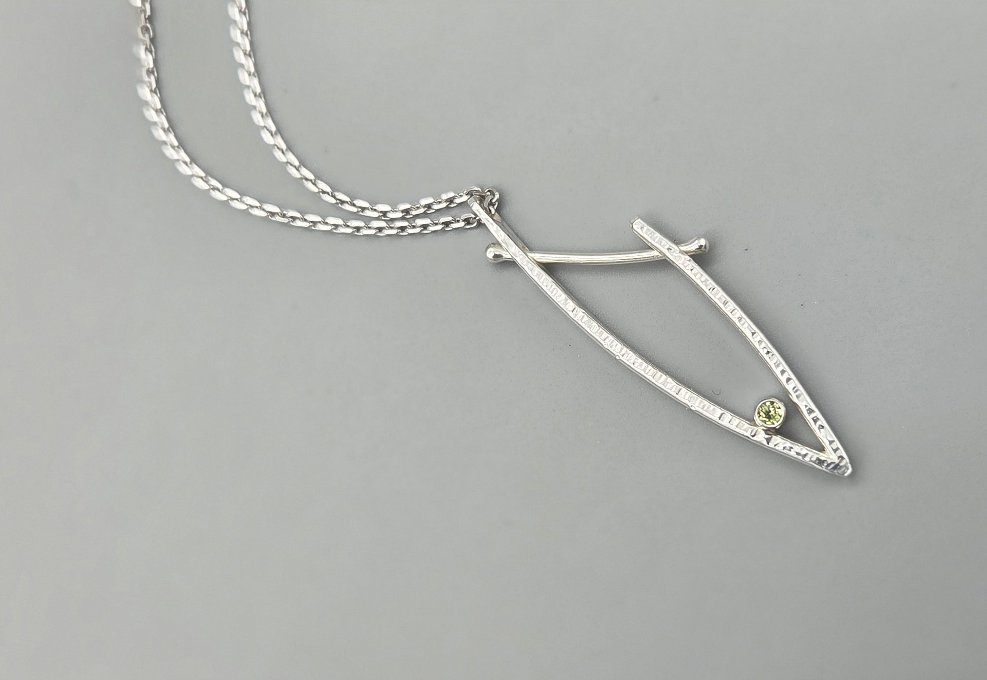 The Art Marquise pendant, features a lovely natural Peridot set in textured Argentium Silver. This striking piece blends bold design with luminous green hues, daring you to stand out. Perfect for those who crave elegance with an adventurous edge.