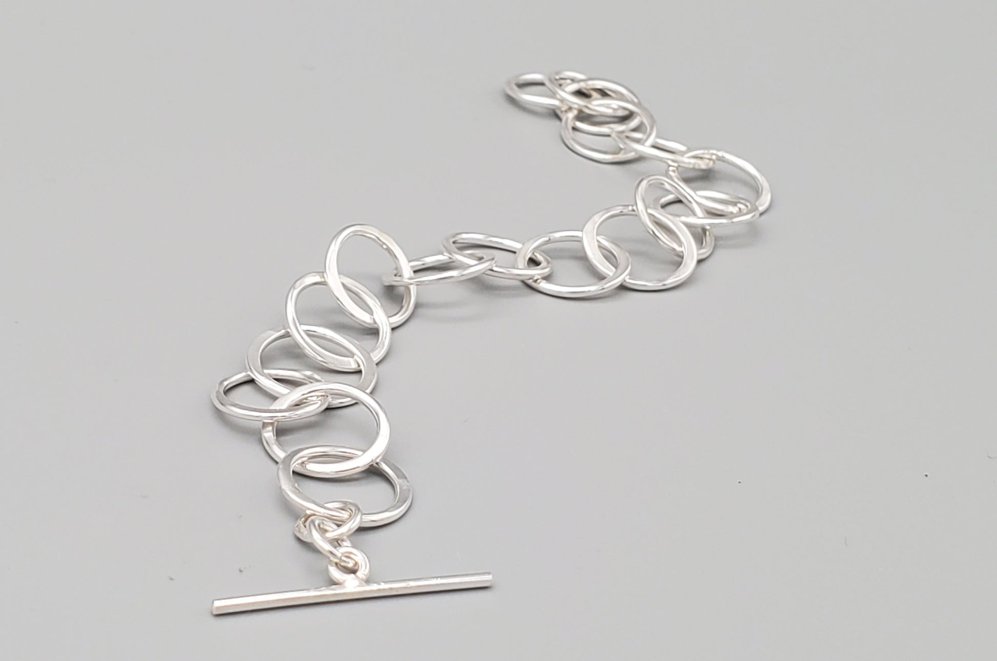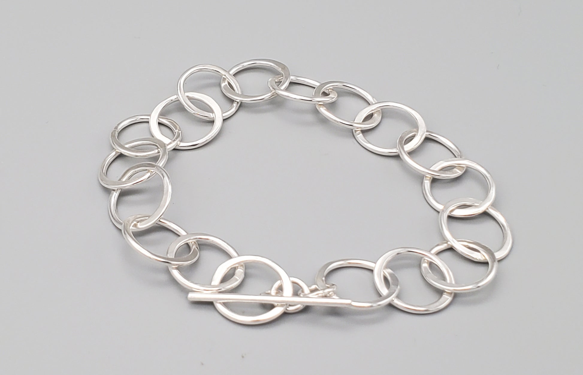 The Eclipse Chain Bracelet showcases substantial half-inch links crafted from argentium silver, a premium alloy prized for its durability and brilliant luster. Each link features a subtle lightly hammered texture that catches the light beautifully, adding dimension and visual interest. The substantial chain design makes a refined statement while remaining comfortable for everyday wear. Argentium silver's superior tarnish resistance ensures your bracelet maintains its sophisticated appearance with minimal maintenance.