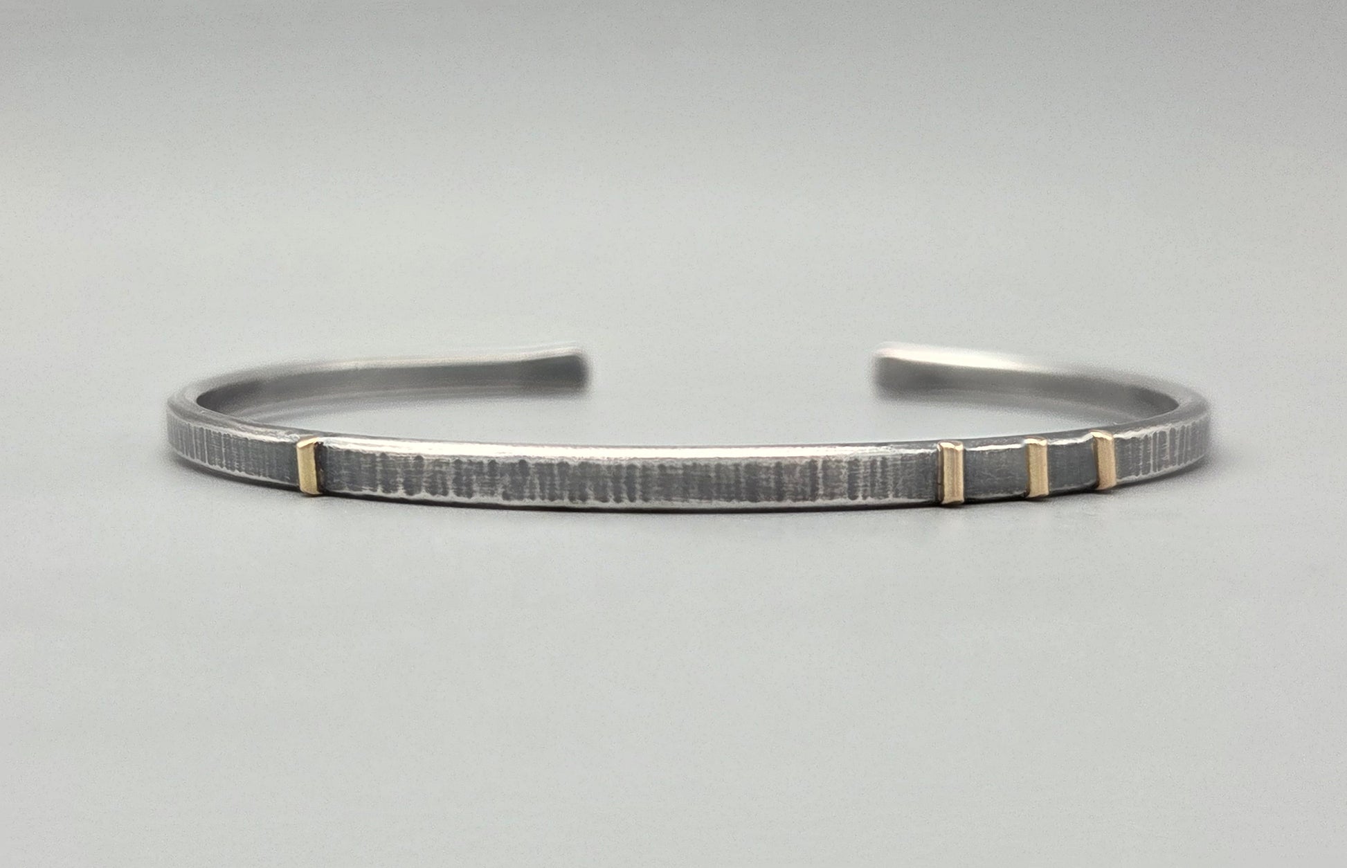 Crafted from heavy argentium silver with a rich oxidized finish, this cuff combines durability with striking texture for a bold, sophisticated look. Featuring elegant 14kt yellow gold accents, it adds a touch of warmth and luxury to any outfit. Perfect for those seeking a statement piece that effortlessly balances strength and style.