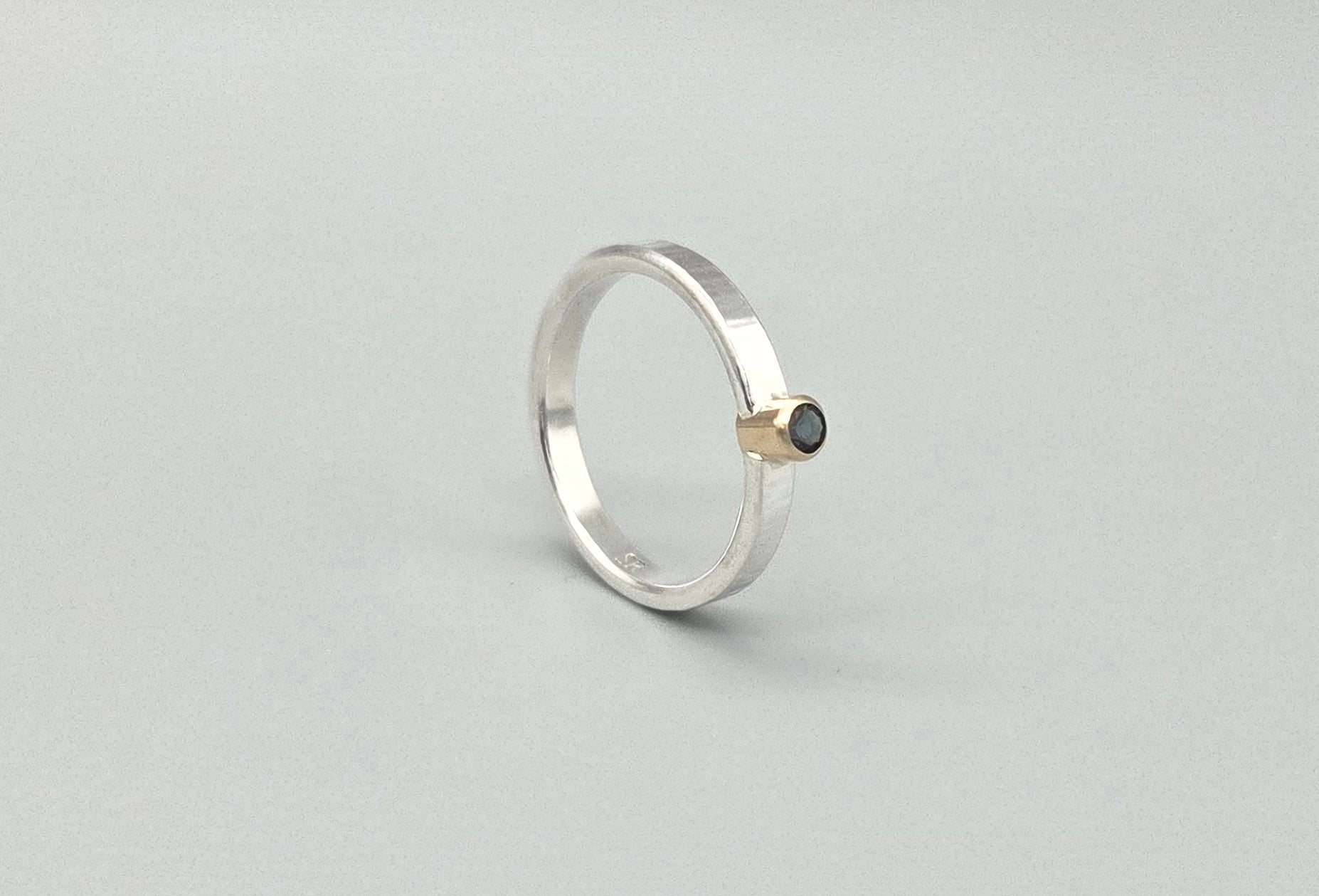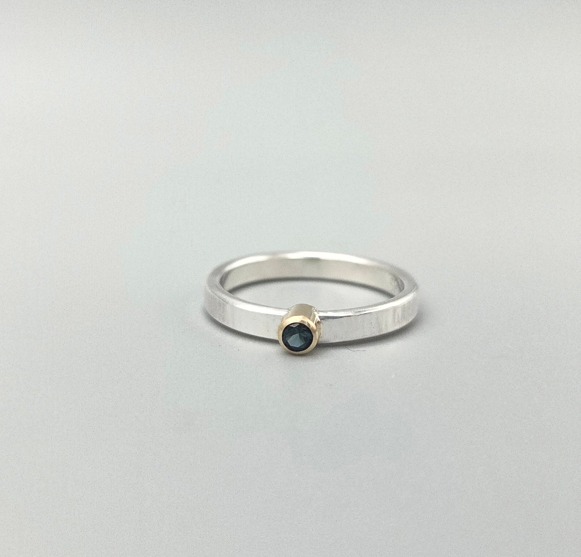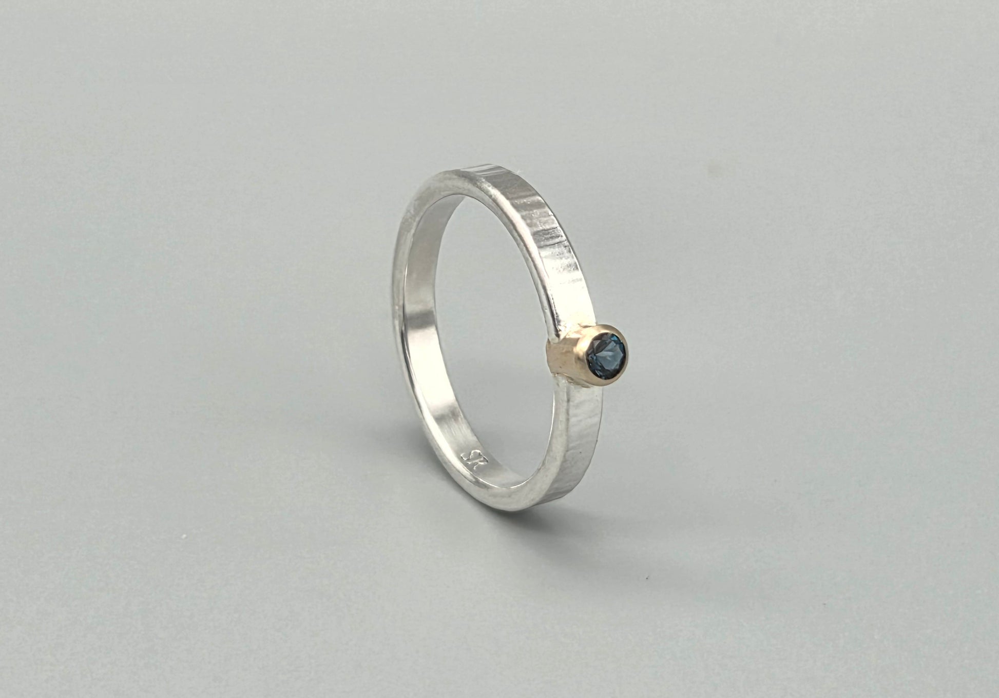 This elegant ring combines the beauty of Argentium silver and 14kt yellow gold with a stunning natural London Blue Topaz gemstone. Its textured design adds unique character, making it perfect for stacking with your favorite rings or wearing alone for a subtle statement. Durable yet stylish, this piece is designed to complement any look while offering lasting comfort and versatility.