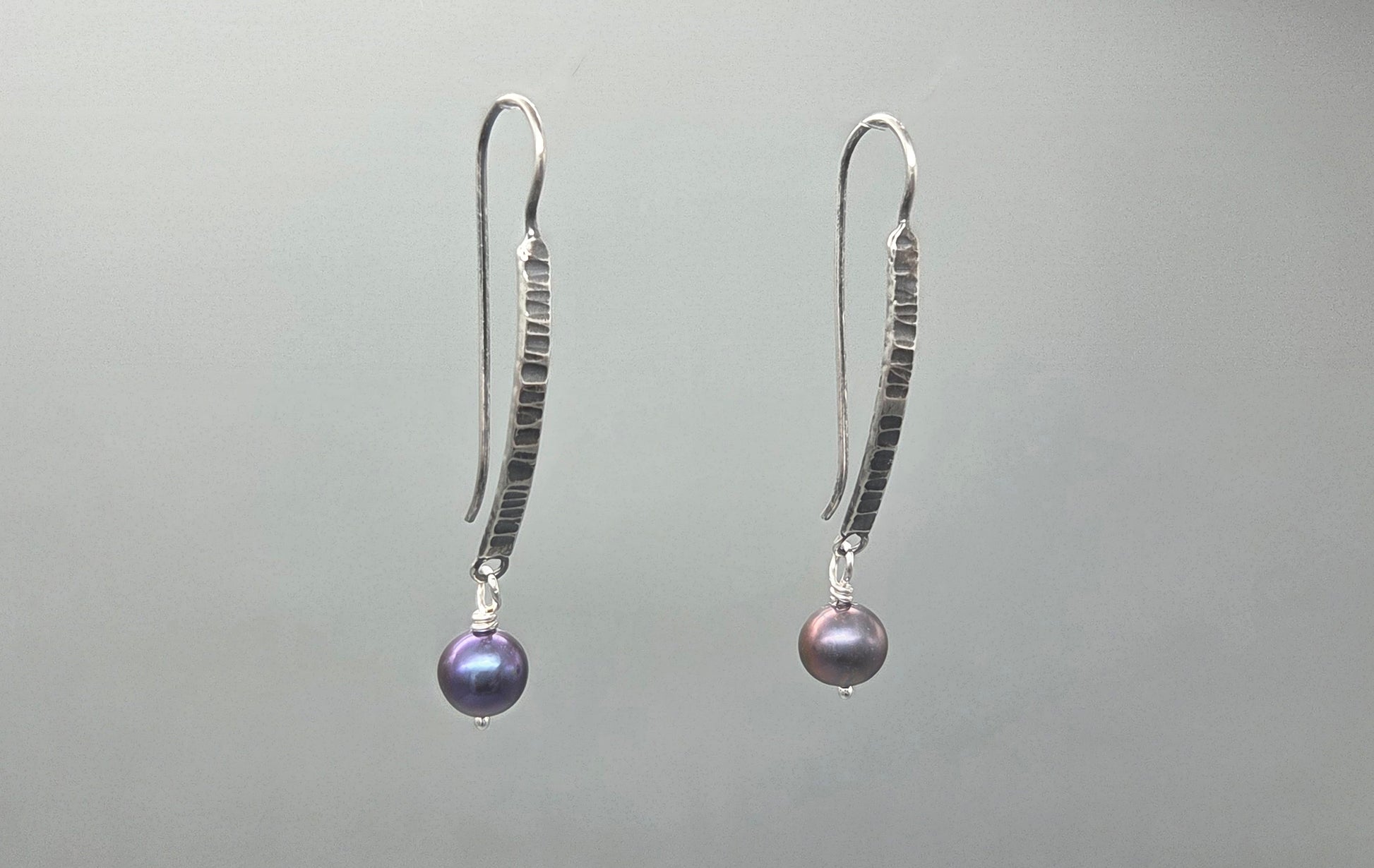 Tahitian Freshwater Pearl Earrings showcase a refined one-piece design crafted from oxidized argentium silver with subtle surface texturing. The darkened silver provides an elegant contrast to the lustrous pearls, creating a timeless aesthetic. Argentium silver's enhanced durability and tarnish resistance ensure these earrings maintain their sophisticated appearance through years of wear. A striking choice for those who appreciate understated luxury and artisanal craftsmanship.