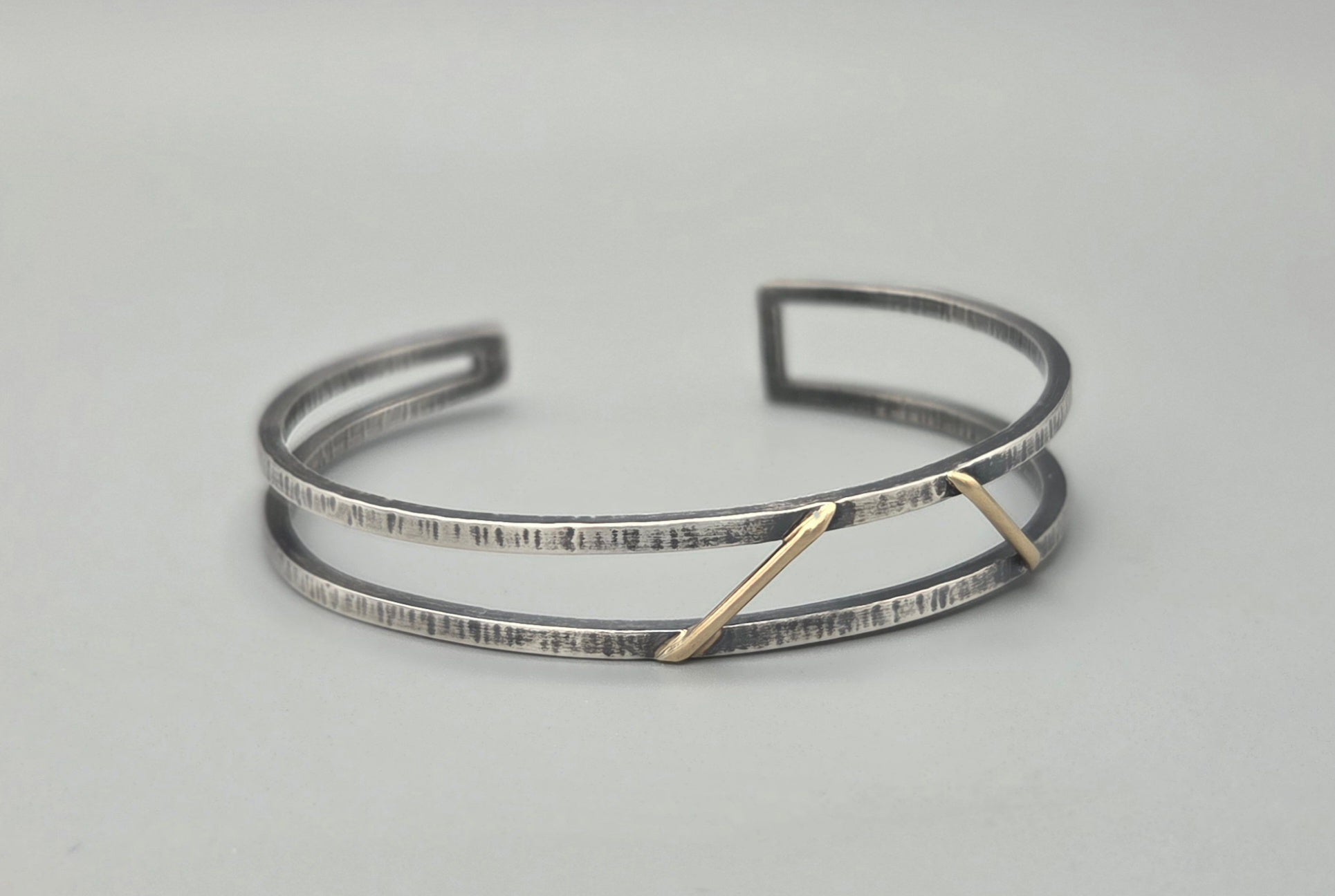 This double cuff bracelet combines the rich warmth of 14kt yellow gold with the sleek modernity of oxidized Argentium Silver. Its textured square design, highlighted by substantial gold accents, creates a bold yet refined statement piece that elevates any outfit. Durable and distinctive, this cuff offers a luxurious mix of style and craftsmanship for those who appreciate unique, eye-catching jewelry.