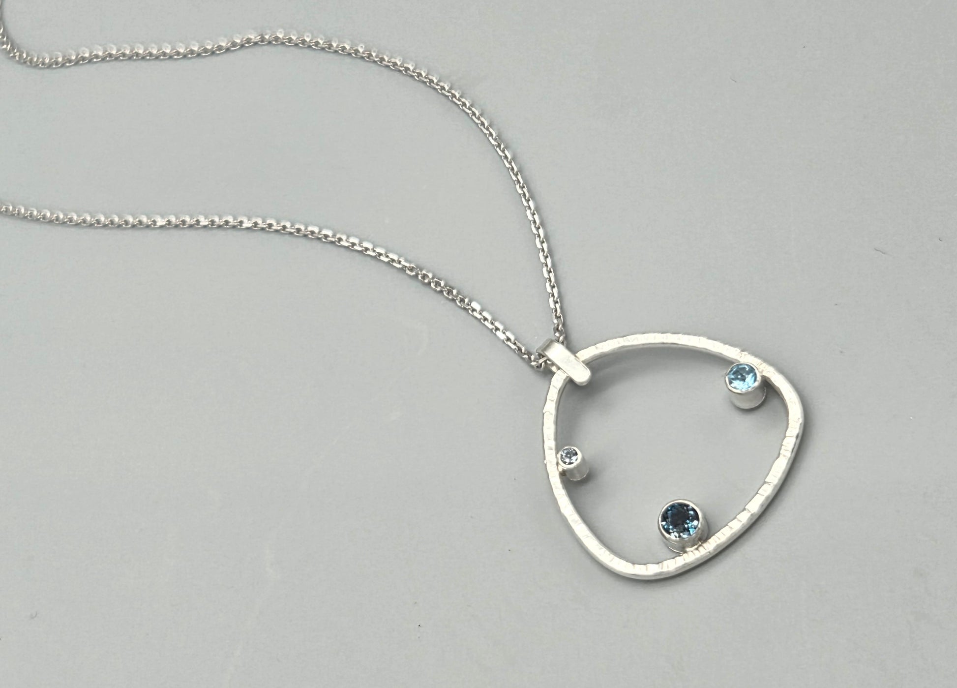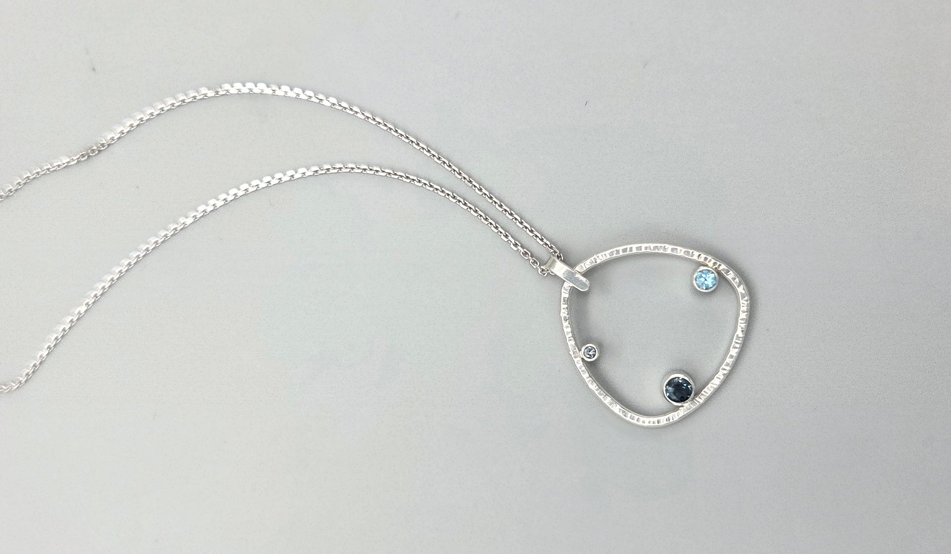 This striking trillion-shaped pendant features a curated blend of sophisticated blue gemstones. This piece showcases London Blue Topaz, Swiss Blue Topaz, and Gray Blue Spinel, each selected for their distinctive depth and character. The textured finish adds refined dimension and catches light beautifully, while the attached bail ensures effortless styling. A modern take on classic elegance, perfect for those who appreciate distinctive gemstone artistry.